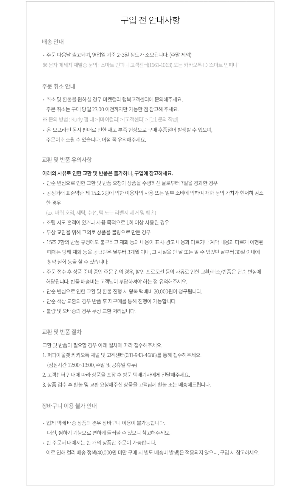 교환 및 환불이 필요하신 경우 [마이컬리 > 주문내역]에서 직접 반품 접수하거나 고객행복센터로 문의해 주시기 바랍니다.