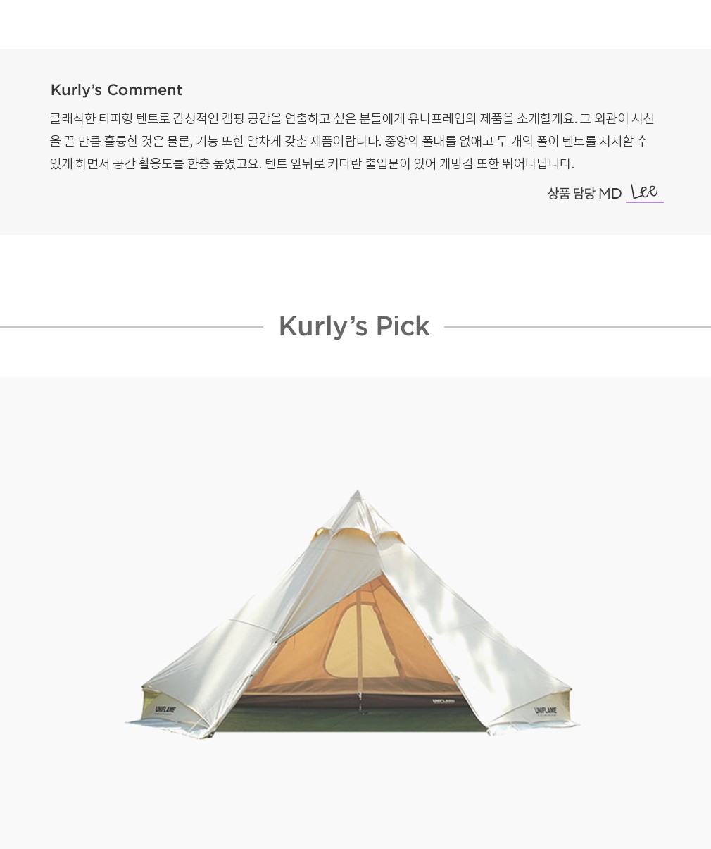 ・특징 : 클래식한 티피 구조의 텐트입니다. 1~2인이 사용하기 좋은 사이즈예요.