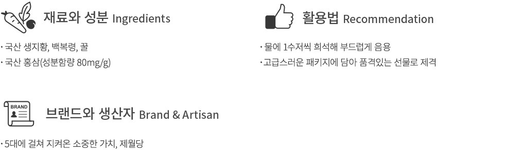 제월당은 1902년부터 5대째 한의정신을 이어오고 있는 전통식품 브랜드예요. 이번에는 100여 년에 걸친 가문의 비법으로 정성껏 만든 제월당의 변석홍옥고를 소개할게요. 변석홍옥고는 국내산 생지황즙, 백복령, 홍삼 등을 오랜 시간 중탕한 뒤 숙성시켜 완성한 제품이에요. 덕분에 재료 본연의 진한 맛과 깊은 풍미가 온전히 담겨 있지요. 한 수저씩 떠서 그대로 섭취하는 것은 물론, 물에 희석해 부드럽게 드셔보세요. 고급스러운 패키지에 담아 보내드리니, 감사한 마음을 전하는 선물로도 참 좋을 거예요.