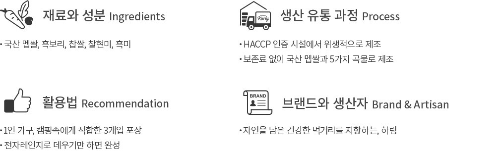 ・특징 : 하림 The 미식의 노하우로 알알이 살아 있는 식감을 완성했어요. 간편한 조리로 드실 수 있는 즉석밥입니다.