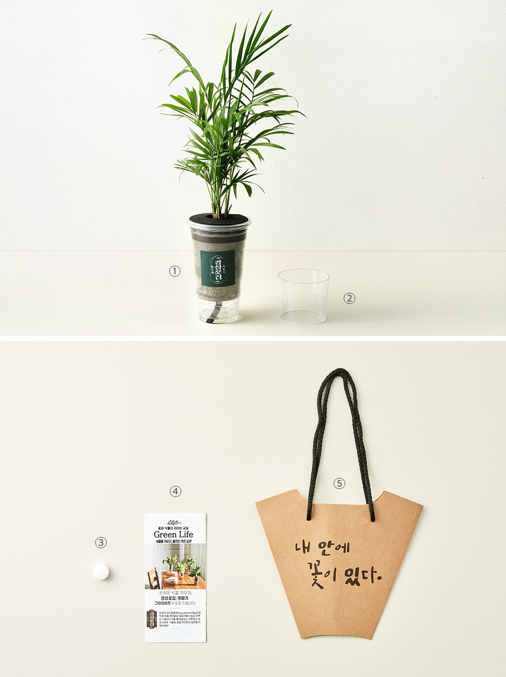 테이블야자 ・구성 : ①식물(테이블야자), ②받침대, ③식물영양제, ④설명서, ⑤쇼핑백