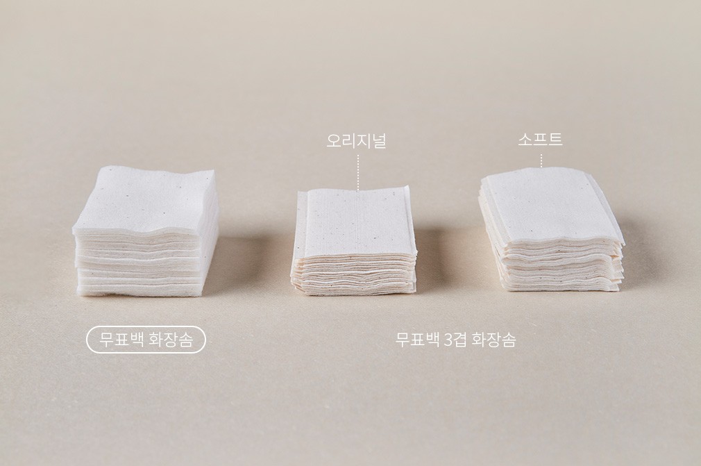 ・ 무표백 3겹 화장솜 오리지널 : 면을 얇고 탄탄하게 압축해서 만든 3겹 화장솜이에요. 먼지날림이 적고 탄탄해서 잘 찢어지지 않아요. 메이크업 클렌징용으로 추천하며, 흡수력과 밀착력이 뛰어나기에 한 장씩 떼어 스킨팩용으로 활용하기 좋아요.