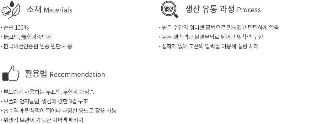 ・ 특징 : 표백하지 않은 순면 화장솜을 얇고 탄탄하게 압축해 3겹으로 겹쳐 실링했어요. 1겹 화장솜에 비해 더욱 탄탄하며, 활용 범위가 넓어요.