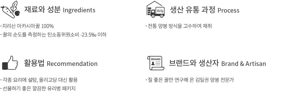 지리산한봉영농조합이 선보이는 아카시아 꿀을 소개할게요. 대를 이어 꿀만을 연구해 온 김일권 양봉 전문가가 전통 양봉 방식으로 생산한 꿀이랍니다. 꿀은 벌이 꿀을 빨아오는 밀원에 따라, 벌이 활동하는 주변 환경에 따라 맛과 향에서 차이가 나는데요. 지금 소개하는 꿀은 깨끗한 지리산 자락의 아카시아 나무 꽃에서 채취해 그 향과 풍미가 더욱 특별해요. 깔끔한 유리병 패키지에 정성껏 포장해 보내 드리니, 주변 분들을 위한 선물로도 참 좋을 거예요.