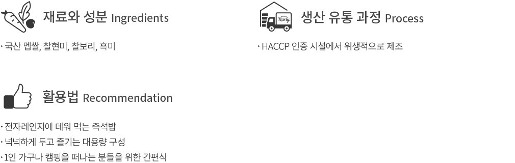 뚝딱 완성되는 간편한 즉석밥, 햇반. 1인 가구나 캠핑을 즐기는 분에게는 없어서는 안 될 필수품이죠. 컬리가 준비한 햇반 매일 잡곡밥으로 소중한 끼니를 든든히 챙겨보세요. 영양 가득한 국내산 멥쌀과 찰현미, 찰보리, 흑미 등을 최적의 비율로 배합해 잡곡밥을 지었기에, 부드러운 식감과 고소한 풍미로 즐길 수 있답니다. 잡곡밥 36개를 박스에 담아 보내드리니, 넉넉히 구비해두고 언제든 따스한 밥 한 끼를 즐겨보세요.