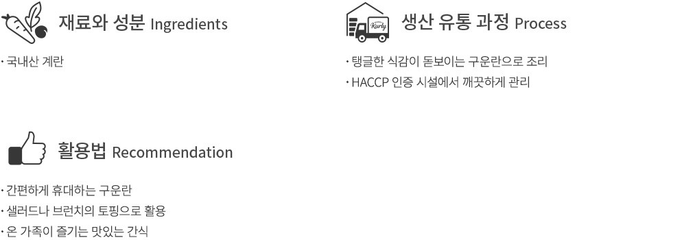 - 알류(계란)함유 - 본 제품은 알류(메추리알), 우유, 메밀, 땅콩, 대두, 밀, 고등어, 게, 새우, 돼지고기, 복숭아, 토마토, 호두, 쇠고기, 닭고기, 오징어, 조개류(굴, 전복, 홍합 포함), 아황산류, 잣을 사용하는 제품과 같은 제조시설에서 제조하고 있습니다.