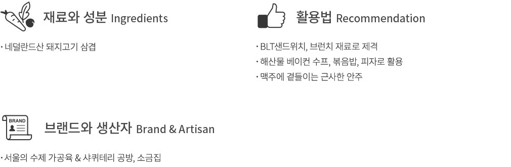 소금집은 고기와 소금, 그리고 시간을 주재료로 가공육을 만드는 공방이에요. 모든 과정에서 사람의 손길이 깃든 샤퀴테리를 선보이고 있는데요. 이번에는 소금집 공방의 시그니처 상품, 훈제 베이컨을 준비했어요. 돼지고기 삼겹 부위에 소금, 후추, 사탕수수 등으로 깔끔하게 염지한 뒤, 섬세한 숙성과 훈연 과정을 거쳐 완성했어요. 보통의 베이컨에 비해 도톰하게 정형해 노릇하게 구워도 부드러운 식감이 살아 있고요. 술안주, 밥반찬, 요리 재료 모두 사용 가능한 팔방미인이랍니다.