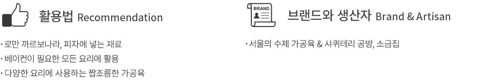 조리법 ・조리 후 섭취하는 가공육입니다. 달궈진 팬에서 센 불로 약 5~7분간 구워 섭취하세요.