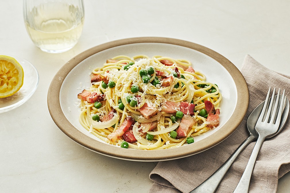 재료 (2인분 기준) 판체타 한팩(120g), 양파 1/2개(100g), 소금 1큰술, 스파게티 180g, 냉동 완두콩 120g, 파르미지아노 레지아노 10g, 레몬 1/2개