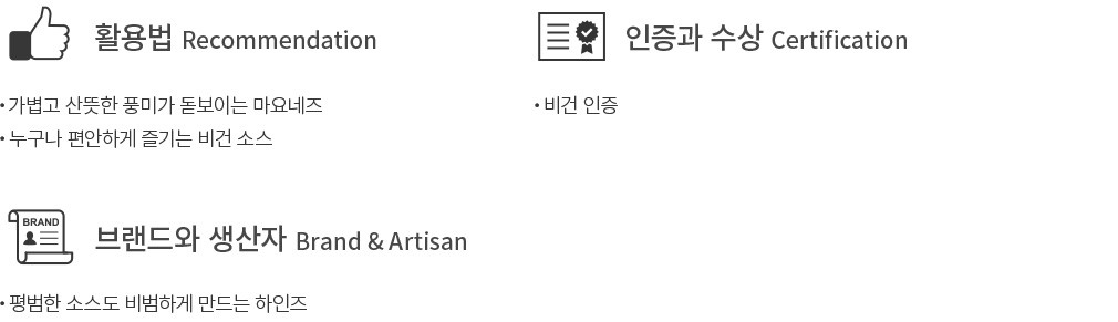 하인즈는 단순한 브랜드 그 이상이죠. 150년에 이르는 하인즈의 역사는 곧 신선한 원재료로 믿을 수 있는 품질을 선보이는 혁신 그 자체이기도 했어요. 이번에 소개할 제품은 어떤 분이든 부담 없이 드실 수 있는 비건 마요네즈입니다. 달걀 대신 농축 레몬 주스와 양파 분말 등으로 담백하고 산뜻한 풍미를 완성했어요. 한층 더 가벼운 소스를 찾으시는 분이나 비건 제품을 선호하시는 분에게 추천해 드립니다. 튀김 요리나 간식에 곁들이는 디핑 소스, 혹은 샐러드 소스로 다양하게 활용해 보세요.