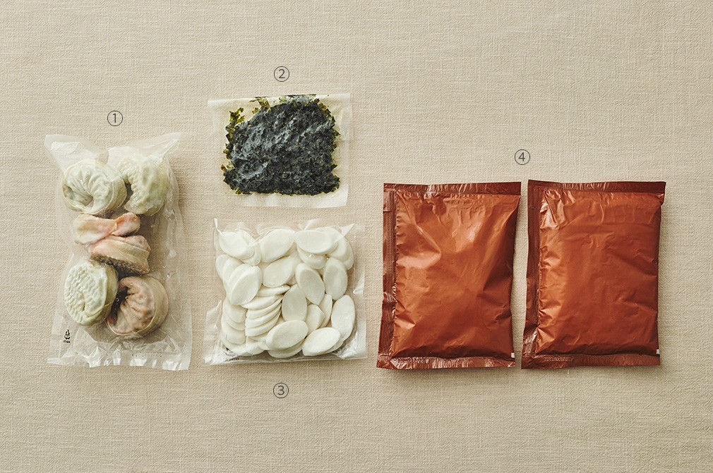 ・구성 : ①만두(고기만두 3알,/ 김치만두 3알) 1팩, ②김 고명 1팩, ③쌀떡 1팩, ④육수 2팩