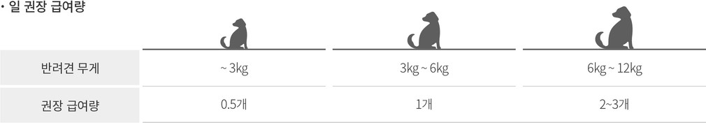 간식 급여 시 주의사항 ・반려견의 연령, 견종, 활동량에 따라 급여량을 조절해주세요.