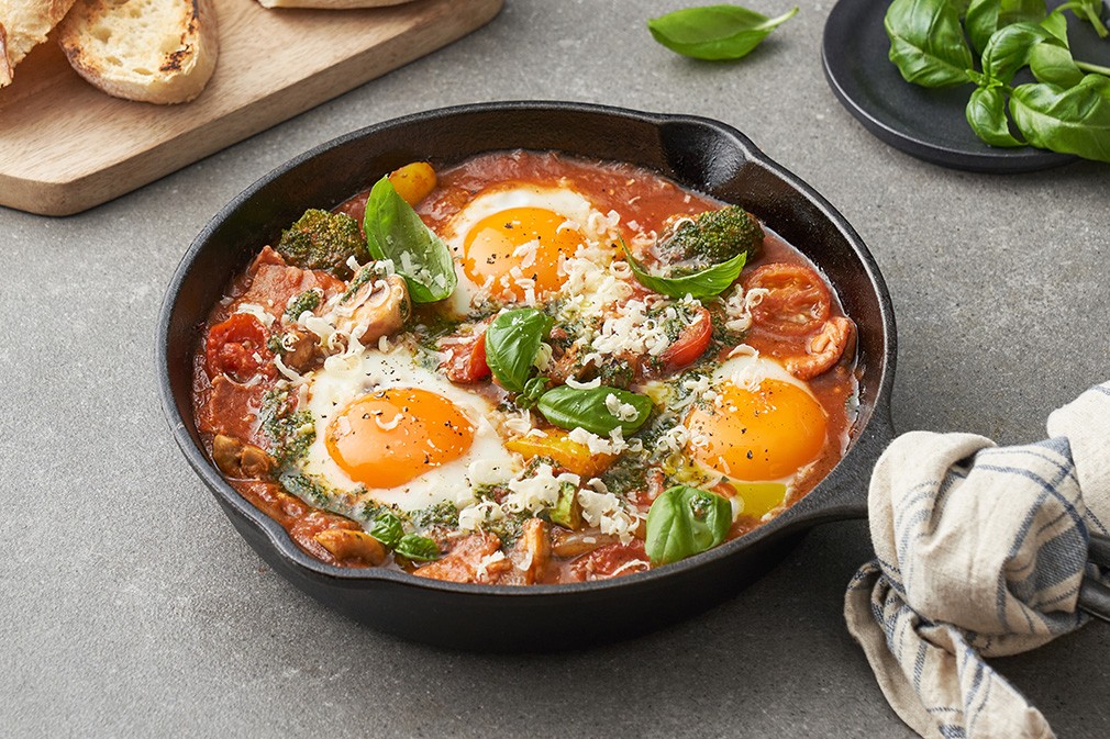재료 (2인분 기준) 방울토마토 6개, 양송이 3개, 브로콜리 1/4개, 파프리카 1/2개, 양파 1개, 베이컨 4장, 마늘 5알, 올리브유 3큰술, 소금 1작은술, 후춧가루 1/2작은술, 달걀 3개, 바질 2줄기, 파마산 치즈 20g, 바게트 1개