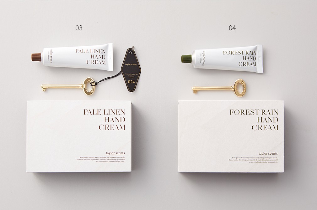 03. 핸드크림 기프트 세트 페일린넨 ・ 구성 : ①핸드크림 페일린넨 1개(50mL) , ②골든키 스퀴저 1개, ③메시지 카드 1장