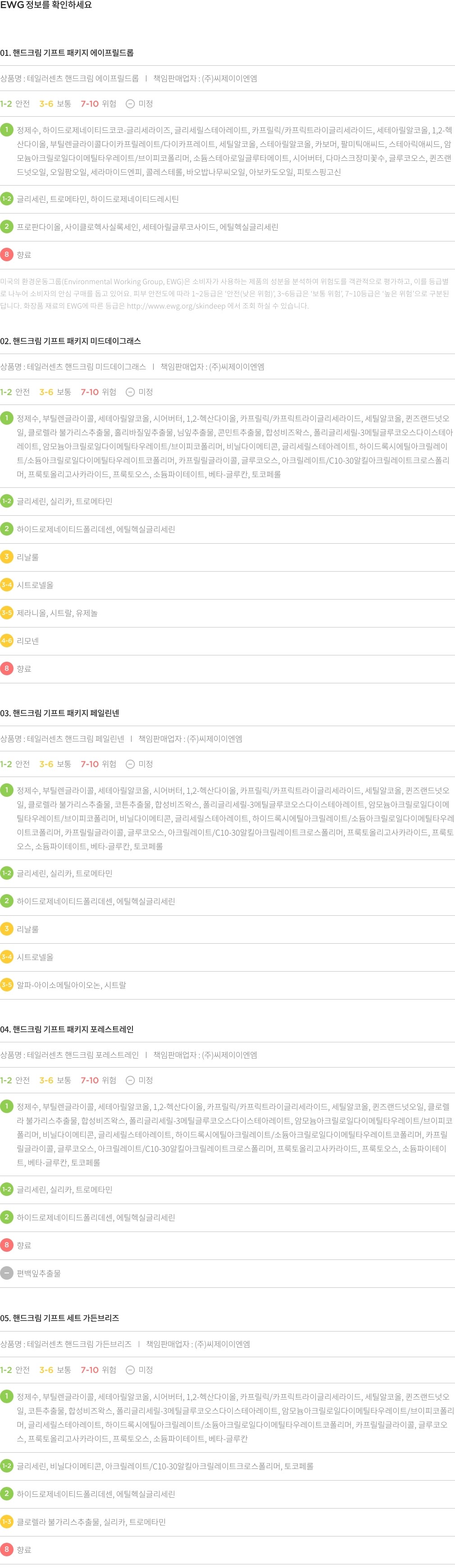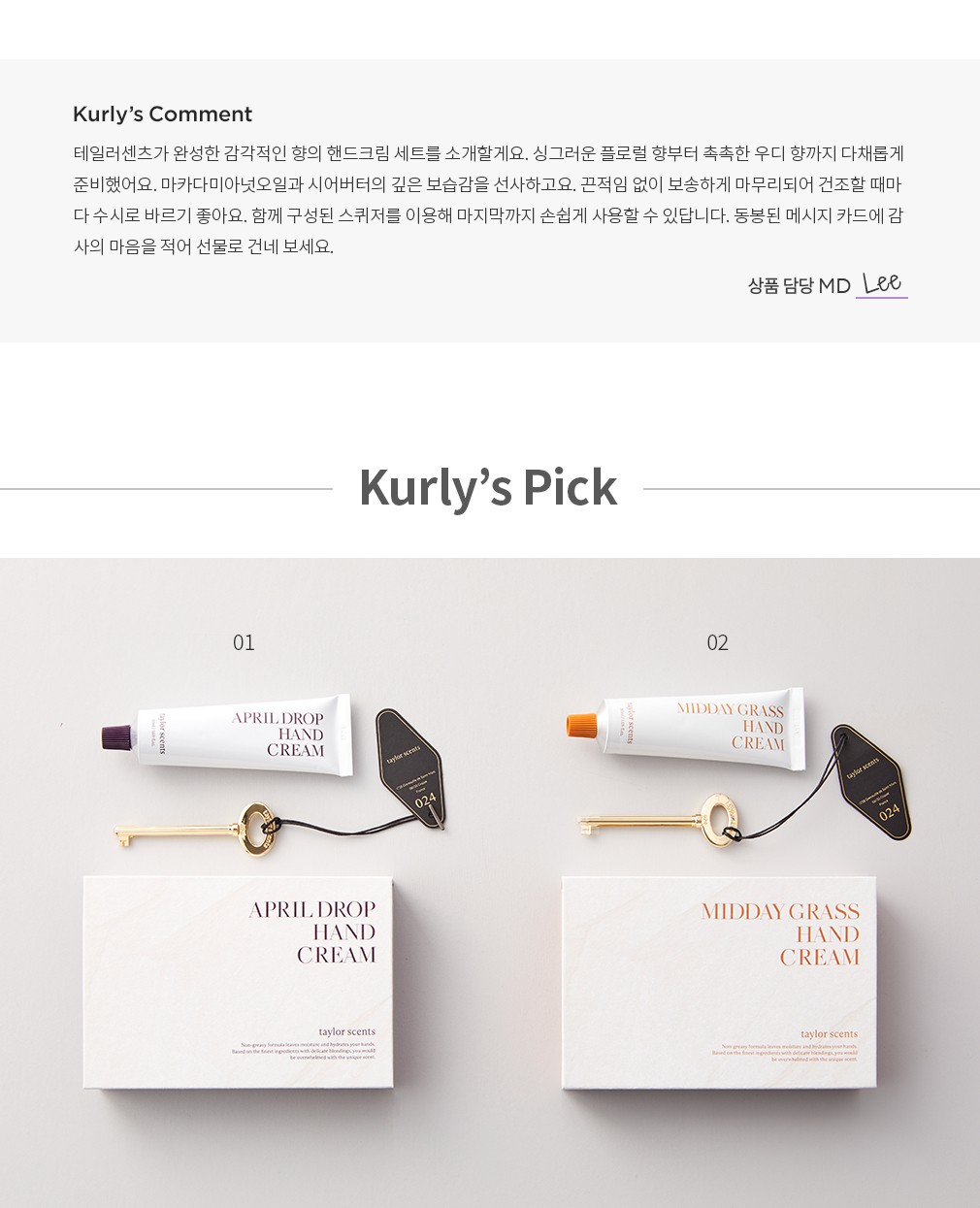 01. 핸드크림 기프트 세트 에이프릴드롭 ・ 구성 : ①핸드크림 에이프릴드롭 1개(50mL) , ②골든키 스퀴저 1개, ③메시지 카드 1장
