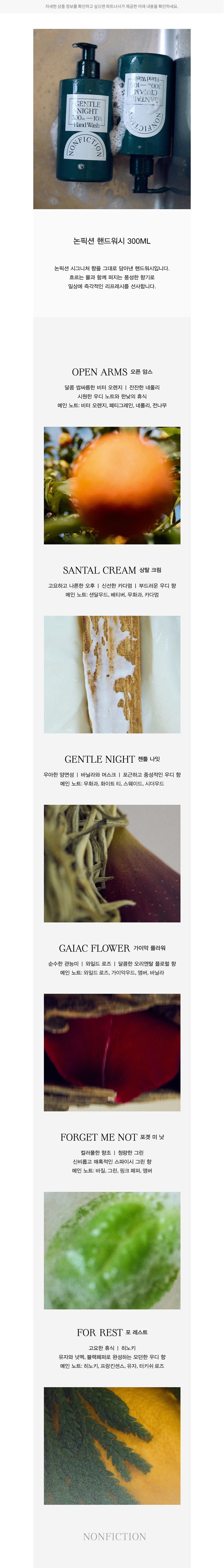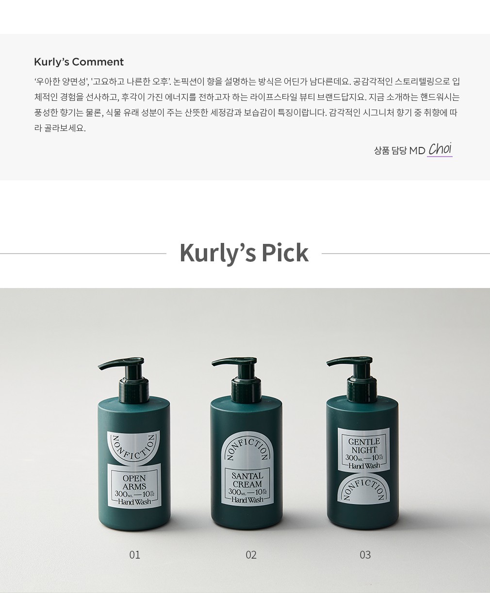 ‘우아한 양면성', '고요하고 나른한 오후’. 논픽션이 향을 설명하는 방식은 어딘가 남다른데요. 공감각적인 스토리텔링으로 입체적인 경험을 선사하고, 후각이 가진 에너지를 전하고자 하는 라이프스타일 뷰티 브랜드답지요. 지금 소개하는 핸드워시는 풍성한 향기는 물론, 식물 유래 성분이 주는 산뜻한 세정감과 보습감이 특징이랍니다. 감각적인 시그니처 향기 중 취향에 따라 골라보세요.