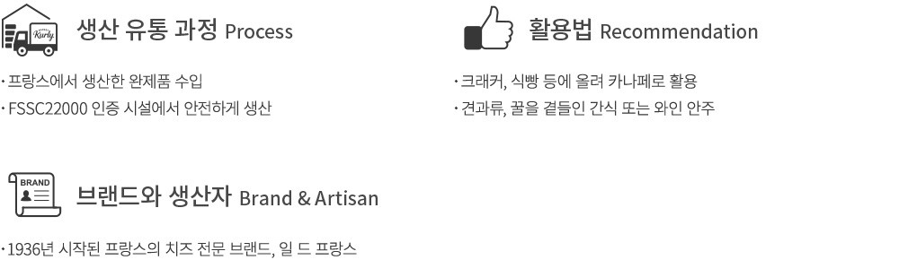 활용팁 ・크래커나 식빵 위에 조각낸 브리 치즈를 얹은 뒤, 건무화과와 견과류를 토핑해 카나페를 만들어 보세요. 꿀을 조금 뿌려 드시면 더욱 잘 어울릴 거예요.