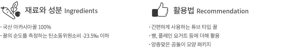 귀여운 곰돌이 모양 패키지로 눈길을 사로잡는 올가비오의 프리미엄 꿀을 소개할게요. 지금 만나볼 프리미엄 아카시아꿀은 감미로운 향을 자랑하는 제품이에요. 부드러운 질감과 함께 은은하고 산뜻하게 감도는 아카시아 향이 매력적이랍니다. 국산 아카시아꿀만을 사용한 것은 물론, 꿀의 순도를 측정하는 탄소동위원소비가 -23.5‰ 이하라 더욱 만족스러워요. 다양한 음식에 달콤함이 필요한 순간 간편하게 사용해보세요. 빵이나 플레인 요거트 등 두루두루 활용하기 좋을 거예요.