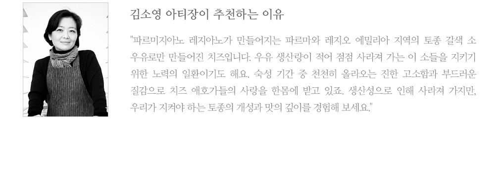‘치즈의 왕’이라고도 불리는 파르미지아노 레지아노는 원산지를 엄격하게 통제하는 DOP*의 보호를 받아 이탈리아에서 생산되는 치즈인데요. 이번에는 이탈리아의 갈색 암소로부터 얻은 우유로 만들어 더욱 특별한 몬타나리의 솔로디브루나를 준비했어요. 30개월의 긴 숙성 기간을 거쳤기에, 갈색 소의 우유만이 지니고 있는 진한 풍미가 보다 깊게 스며 있답니다. 본연의 맛을 오롯이 즐길 수 있도록 작게 슬라이스해 와인에 곁들여 보세요. 풍부한 고소함을 자랑하니, 그레이터로 갈아 다양한 요리의 토핑으로 활용하기에도 제격일 거예요.