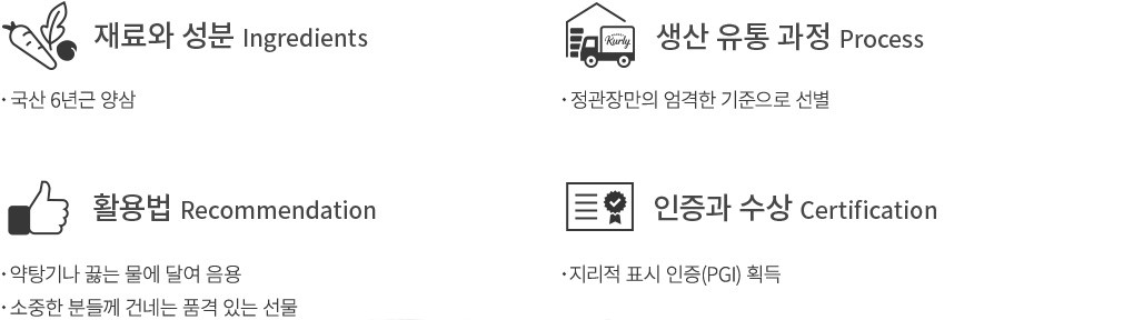 ・지삼 : ‘땅의 기운을 품은 홍삼’을 뜻하는 지삼은 두 번째로 귀하다고 여겨지는 홍삼이에요. 내부 조직이 치밀하고 견고한 점이 특징이랍니다.