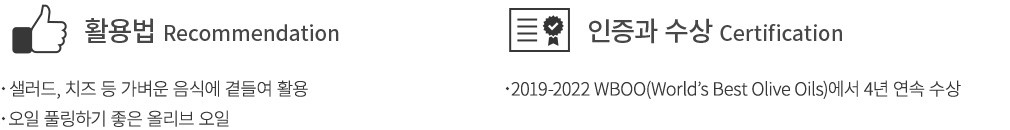 산도: 0.2% / 올레인산: 65~83% / 리놀레산3.5~21%/ 폴리페놀 650mg