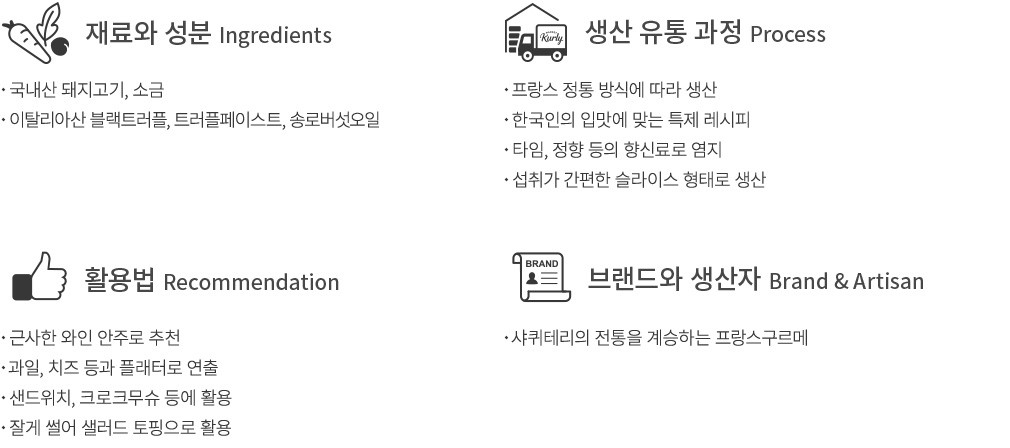 사퀴테리는 프랑스에서 식전주와 함께 또는 전채 요리로 즐겨 먹는 소시지, 햄을 뜻하는데요. 프랑스인 셰프가 현지 정통 방식으로 생산하는 샤퀴테리, 프랑스구르메에서 소개할게요. 이번엔 그윽한 풍미가 고루 배어든 트러플 잠봉을 준비했어요. 국내산 돼지고기로 만들어 식감은 부드럽고요. 이탈리아산 블랙 트러플, 트러플 페이스트 등을 가미해, 씹을수록 독특한 맛과 향이 살아난답니다. 슬라이스 형태로 담은 상품이니 간단한 와인 안주 또는 샌드위치의 속재료로도 활용해 보세요.