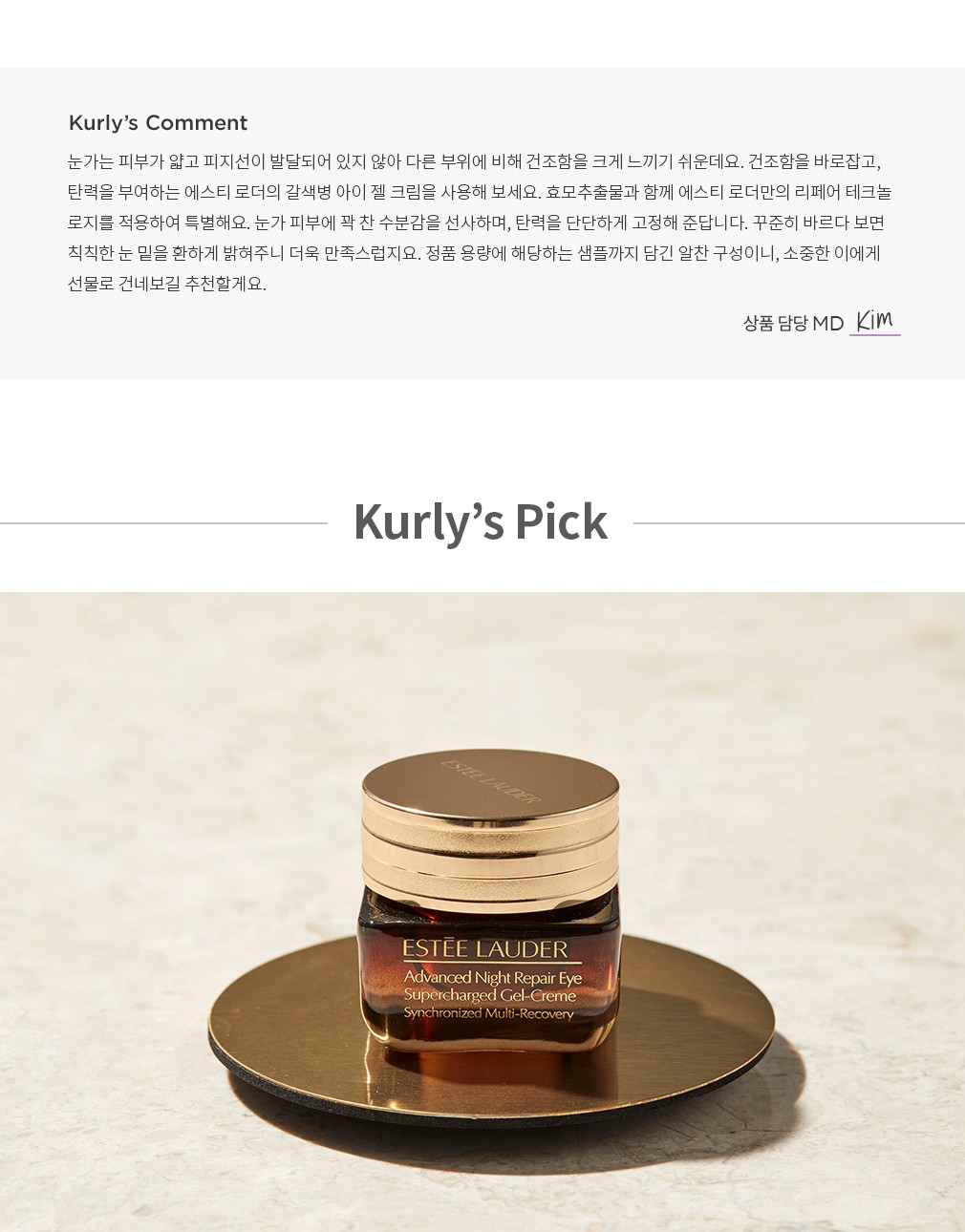 눈가는 피부가 얇고 피지선이 발달되어 있지 않아 다른 부위에 비해 건조함을 크게 느끼기 쉬운데요. 건조함을 바로잡고, 탄력을 부여하는 에스티 로더의 갈색병 아이 젤 크림을 사용해 보세요. 효모추출물과 함께 에스티 로더만의 리페어 테크놀로지를 적용하여 특별해요. 눈가 피부에 꽉 찬 수분감을 선사하며, 탄력을 단단하게 고정해 준답니다. 꾸준히 바르다 보면 칙칙한 눈 밑을 환하게 밝혀주니 더욱 만족스러워요.