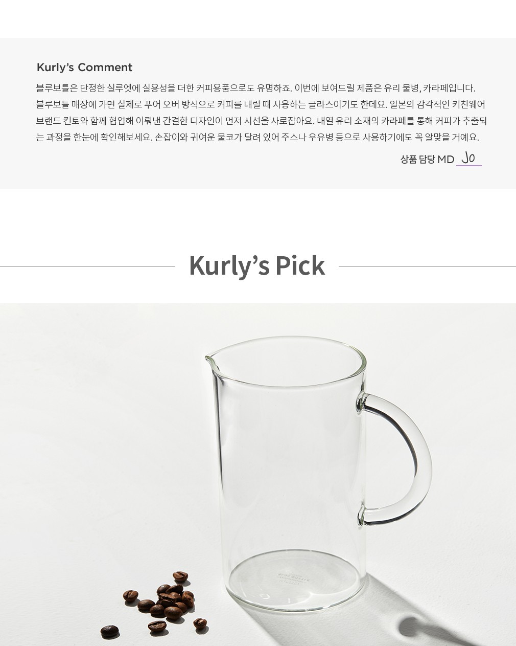 ・특징 : 블루보틀 매장에서 푸어 오버 방식으로 커피를 추출할 때 사용하는 카라페입니다. 열에 강하고 내구성이 좋은 내열 유리 소재로 만들어졌어요.