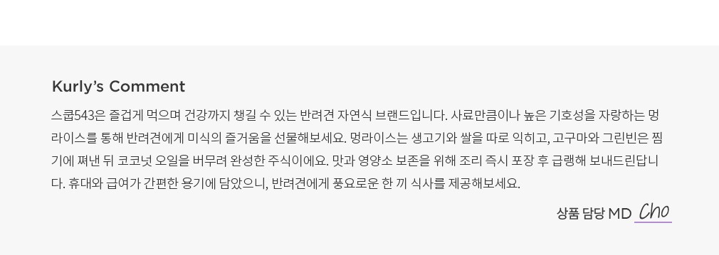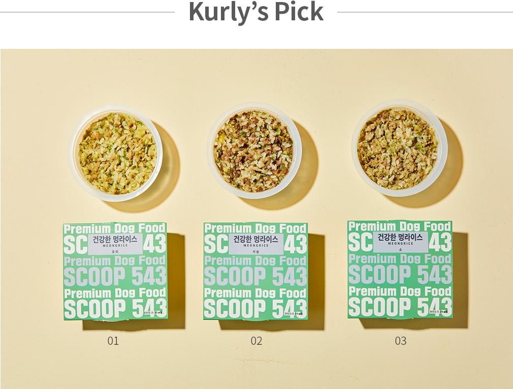 스쿱543은 어떻게 하면 반려견이 더 건강해지고 행복해질 수 있을지에 대한 고민에서 출발한 자연식 브랜드입니다. 반려견의 다양한 취향을 반영한 5가지 카테고리 안에서 4가지 첨가물을 배제하여, 건강함과 깨끗함, 맛이라는 3가지 약속을 지킨다는 뜻을 담아 붙여진 이름이기도 하죠. 스쿱543은 반려견이 다양한 영양소를 섭취할 수 있도록 수의사와 영양 전문가에게 자문을 구해 식재료 선택부터 신중을 가합니다. 레시피 연구와 배송과 급여, 실제로 잘 먹었는지까지 모든 과정에도 관여하며 철저히 관리하고요. 위생과 직결되는 자연식 특성을 고려해 생식의 경우 감마선 멸균 처리 공정을 거쳐 반려견의 안전까지 살뜰히 챙긴답니다. 생식부터 특별식과 디저트까지. 스쿱543을 통해 반려견을 새로운 미식의 세계로 이끌어주세요.