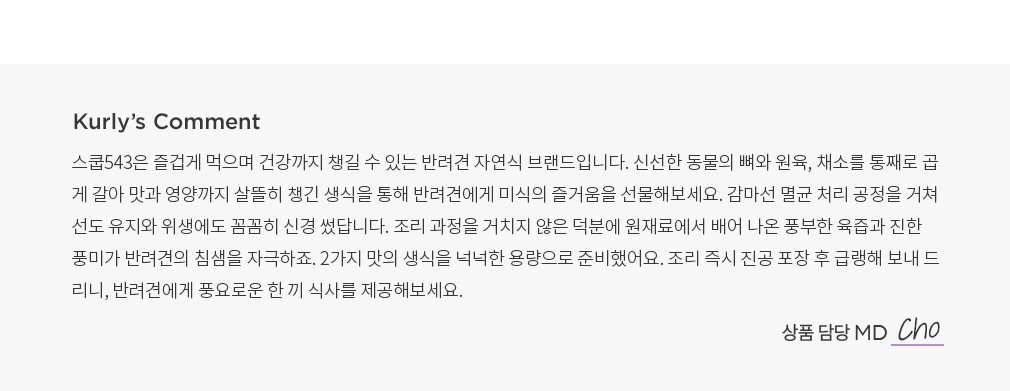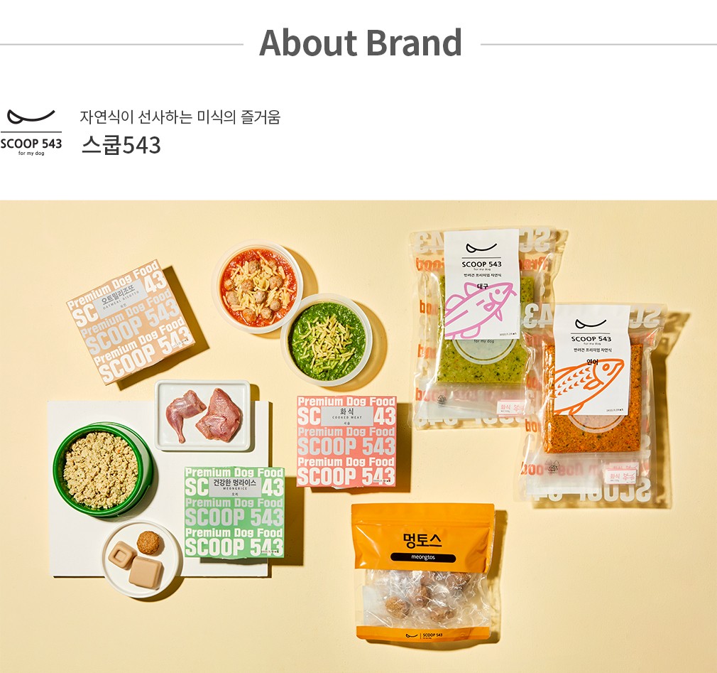 스쿱543은 어떻게 하면 반려견이 더 건강해지고 행복해질 수 있을지에 대한 고민에서 출발한 자연식 브랜드입니다. 반려견의 다양한 취향을 반영한 5가지 카테고리 안에서 4가지 첨가물을 배제하여, 건강함과 깨끗함, 맛이라는 3가지 약속을 지킨다는 뜻을 담아 붙여진 이름이기도 하죠. 스쿱543은 반려견이 다양한 영양소를 섭취할 수 있도록 수의사와 영양 전문가에게 자문을 구해 식재료 선택부터 신중을 가합니다. 레시피 연구와 배송과 급여, 실제로 잘 먹었는지까지 모든 과정에도 관여하며 철저히 관리하고요. 위생과 직결되는 자연식 특성을 고려해 생식의 경우 감마선 멸균 처리 공정을 거쳐 반려견의 안전까지 살뜰히 챙긴답니다. 생식부터 특별식과 디저트까지. 스쿱543을 통해 반려견을 새로운 미식의 세계로 이끌어주세요.