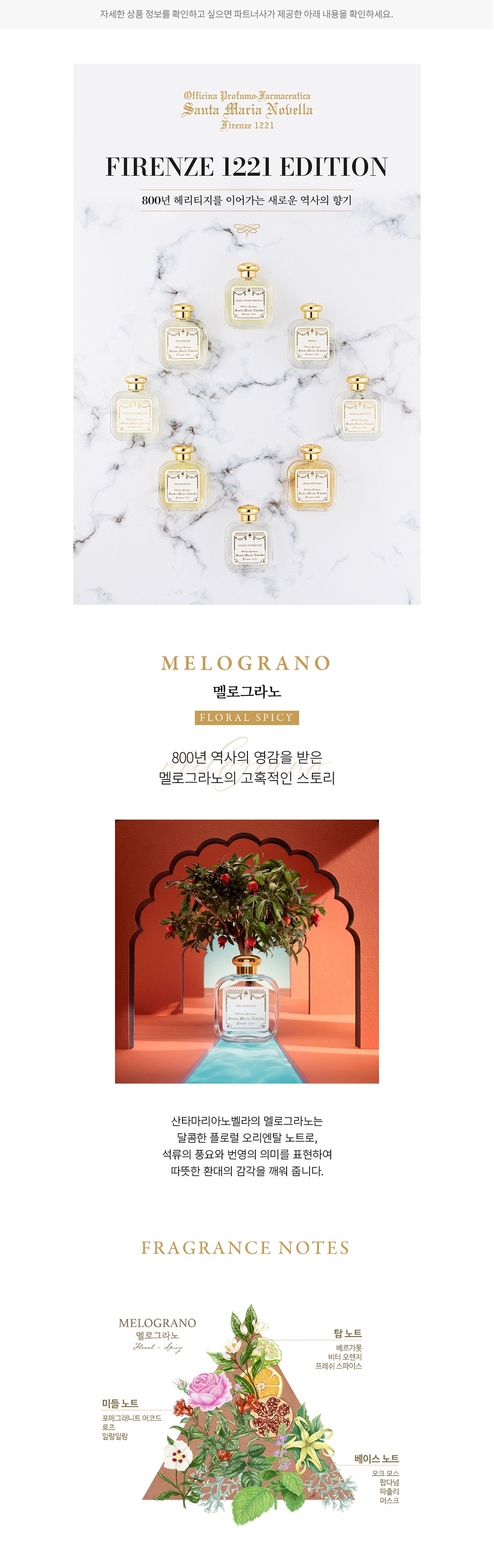 피렌체 1221 에디션 산타마리아노벨라의 800년 헤리티지를 현대적으로 재해석한 피렌체 1221 에디션을 소개합니다. 산타마리아노벨라의 아이코닉한 향이 담긴 오 드 코롱과 바디 컬렉션, 왁스 타블렛, 세 가지의 에디션을 새롭게 선보였어요. 오래전 수도사들이 사용했던 유리병을 오마쥬한 투명한 향수 바틀, 산타마리아노벨라의 문양이 새겨진 골드 캡, 그리고 피렌체의 전통 양식을 계승한 라벨 디자인까지. 새로운 패키지로 태어난 산타마리아노벨라의 특별한 에디션을 만나보세요.