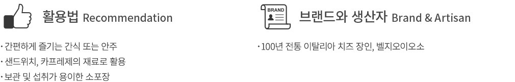 간편하고 부담 없이 즐길 수 있는 치즈를 찾으신다면, 지금 소개하는 벨지오이오소의 제품이 마음에 드실 거예요. 한 번에 즐기기 좋은 양만큼 담은 프로볼론 치즈 스낵팩이랍니다. 순한 풍미에 부드러운 맛을 지닌 프로볼로네 치즈는 다양한 요리에 사용하기 좋은데요. 가벼운 와인 안주는 물론, 샌드위치나 카프레제 등의 재료로 활용하기에도 제격이지요. 소포장된 치즈 8개를 보내드리니, 하나씩 꺼내어 간편하게 즐겨보세요.