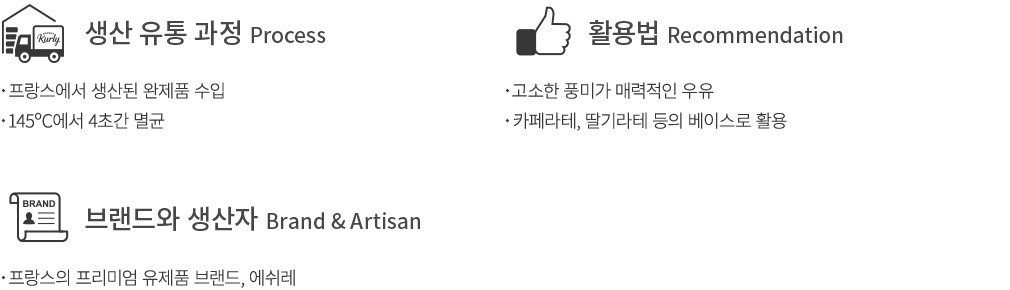 130년 이상의 오랜 전통을 자랑하는 프랑스의 유제품 브랜드, 에쉬레가 선보이는 멸균 우유를 컬리에서 만나 보세요. 뛰어난 풍미의 버터로 이름난 에쉬레가 만든 만큼, 원유 본연의 풍미가 고스란히 담겨 있습니다. 한 모금 머금으면 실크처럼 부드러운 질감과 함께 치즈를 연상시킬 정도로 고소한 풍미가 한껏 느껴져요. 잔에 담아 그대로 마시기만 해도 충분한 존재감을 자랑하는데요. 쌉쌀한 에스프레소를 더해 카페라테로 즐겨도 좋을 거예요. 에쉬레가 선사하는 미식 경험을 놓치지 마세요.