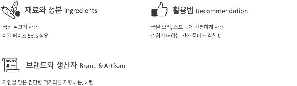 국산 닭고기로 만들어 더욱 안심하고 즐길 수 있는 하림의 치킨스톡을 만나보세요. 국산 닭고기와 무, 양파, 건표고버섯 등 14가지의 재료를 오랜 시간동안 우려내 완성했답니다. 치킨 베이스를 55%나 함유하고 있어 한층 진하고 자연스러운 감칠맛이 돋보이지요. 다양한 국물 요리부터, 파스타나 볶음 요리까지 두루두루 사용해 보세요. 소량만 사용해도 아쉬웠던 맛의 한끗을 채워주기 충분할 거에요.