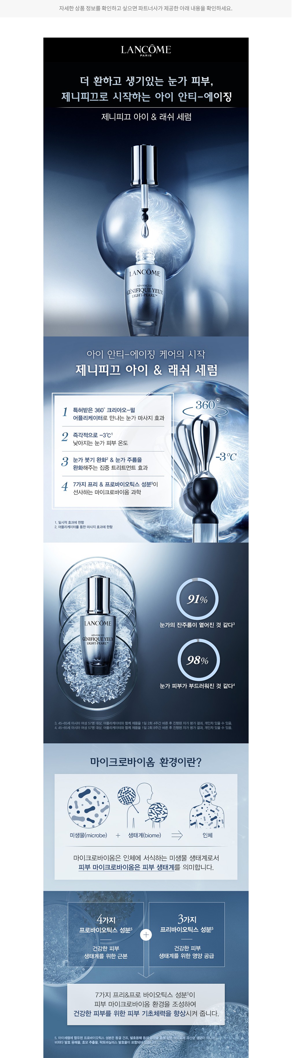 어드밴스드 제니피끄 마이크로바이옴이란 미생물(Microbe)이 살아가는 생태계(Biome)를 의미해요. 우리 몸에도 마이크로바이옴이 존재하며 피부와 지속적으로 상호작용을 하고 있죠. 따라서 마이크로바이옴의 균형이 잘 유지될수록 피부의 근본적인 힘이 강화되는데요. 일찍이 이 사실을 발견한 랑콤은 2009년 이래로 마이크로바이옴에 대한 연구와 개발을 이어왔어요. 그 결과물이 지금 소개하는 어드밴스드 제니피끄 3세대입니다.
