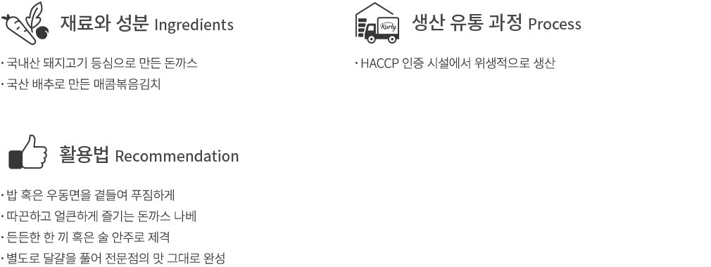 * 바싹통듬심돈까스 : 돼지고기, 우유, 대두, 밀 함유 * 매콤볶음김치 : 대두, 밀 함유 * 맛소스 : 대두, 밀 함유 * 본 제품은 난류, 우유, 메밀, 땅콩, 밀, 고등어, 게, 새우, 돼지고기, 복숭아, 토마토, 아황산류, 호두, 닭고기, 토마토, 호두, 쇠고기, 오징어, 조개류(굴, 전복, 홍합 포함), 잣을 사용한 제품과 같은 제조시설에서 제조하고 있습니다.