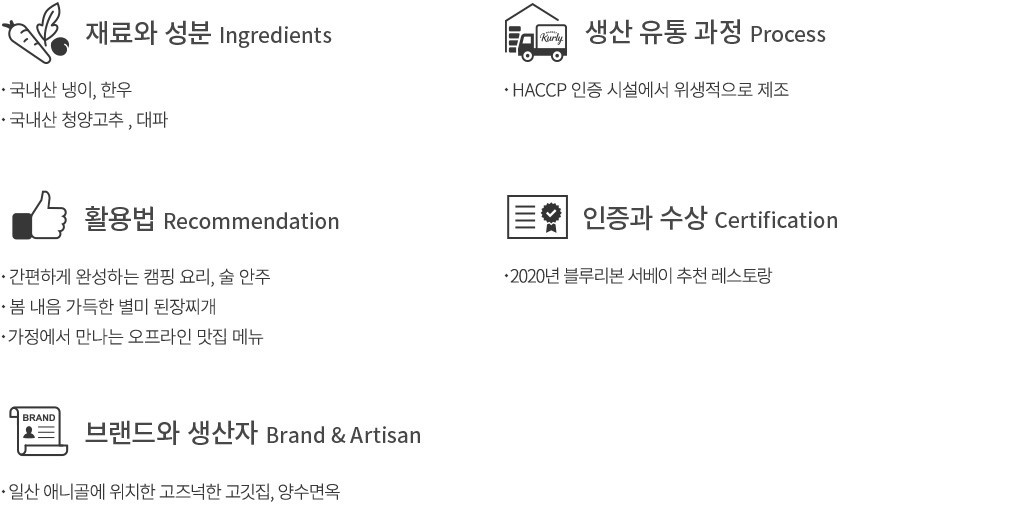 - 대두, 밀, 소고기, 새우, 닭고기, 우유, 조개류(굴,전복,홍합 포함) 함유 - 난류, 메밀, 땅콩, 고등어, 게, 돼지고기, 복숭아, 토마토, 아황산류, 호두, 오징어, 잣을 사용한 제품과 같은 제조 시설에서 제조