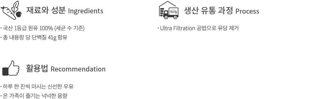・특징 : 유당은 없애고 우유의 고소함만 담아 부담 없이 즐길 수 있는 우유예요. 한 팩 당 단백질이 41g 함유되어 있답니다.