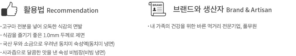 * 동치미 냉면 : 대두, 밀 함유 이 제품은 메밀, 게, 새우, 고등어, 알류, 땅콩, 우유, 쇠고기, 돼지고기, 복숭아, 토마토, 호두, 닭고기, 오징어, 조개류(굴, 전복 홍합 포함), 잣을 사용한 제품과 같은 제조시설에서 제조하고 있습니다. * 함흥비빔냉면 : 대두, 밀 함유 * 이 제품은 메밀, 게, 새우, 고등어, 알류, 땅콩, 우유, 쇠고기, 돼지고기, 복숭아, 토마토, 호두, 닭고기, 오징어, 조개류(굴, 전복 홍합 포함), 잣을 사용한 제품과 같은 제조시설에서 제조하고 있습니다.