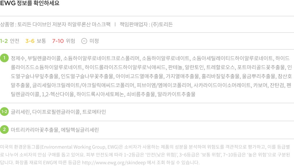 활용팁 ・ 마스크를 제거하고 남은 에센스를 흡수시킨 후 토리든의 다이브인 저분자 히알루론산 세럼을 한 번 더 덧발라 보세요. 더욱 풍부한 수분감을 느낄 수 있습니다.