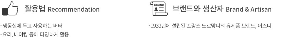 유럽의 전통 제조법으로 버터를 만드는 프랑스 브랜드, 이즈니의 무염 롤 버터를 만나 보세요. 신선한 우유로 만들어 고소하면서도 산뜻한 풍미가 잘 살아있는데요. 냉동 보관이 가능하기 때문에 보관 걱정 없이 두고두고 활용하기 좋답니다. 냉장고에서 하루 동안 해동한 다음, 조금씩 소분하여 빵에 발라 드시거나 베이킹에 활용해 보세요. 부담 없이 사용하기 좋은 버터를 찾으시는 분에게 추천해 드립니다.