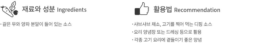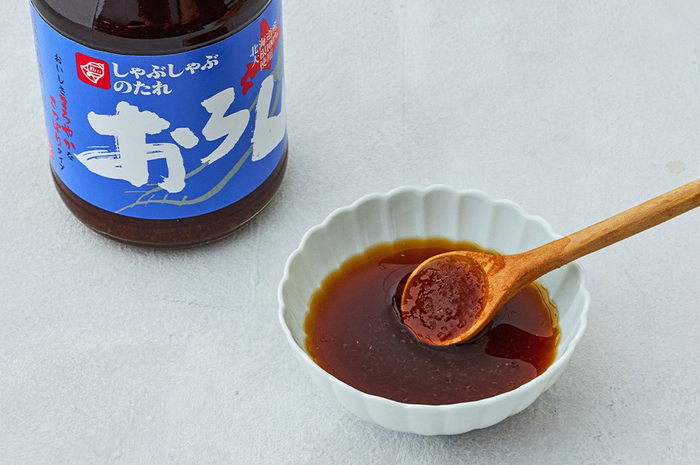 샤브샤브의 완성은 소스라고 해도 과언이 아니지요. 이번에는 50년 이상의 노하우를 자랑하는 일본의 식품 브랜드, 베루의 오로시 샤브샤브 소스를 준비했어요. 갈은 무를 아낌 없이 넣어 입자감이 느껴지는 것이 가장 큰 특징인데요. 양파분말과 와인식초, 미림 등을 더해 감칠맛을 한껏 끌어올렸답니다. 샤브샤브 속 고기나 채소를 찍어 먹는 것은 물론 샐러드 드레싱으로 활용해도 아주 좋을 거예요.