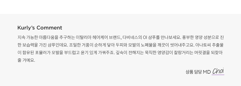 추천 루틴 ・ 다비네스의 OI 컨디셔너와 함께 사용해 보세요. 깊은 영양감과 수분감을 전해 더욱 찰랑거리는 머릿결을 만날 수 있을 거예요.
