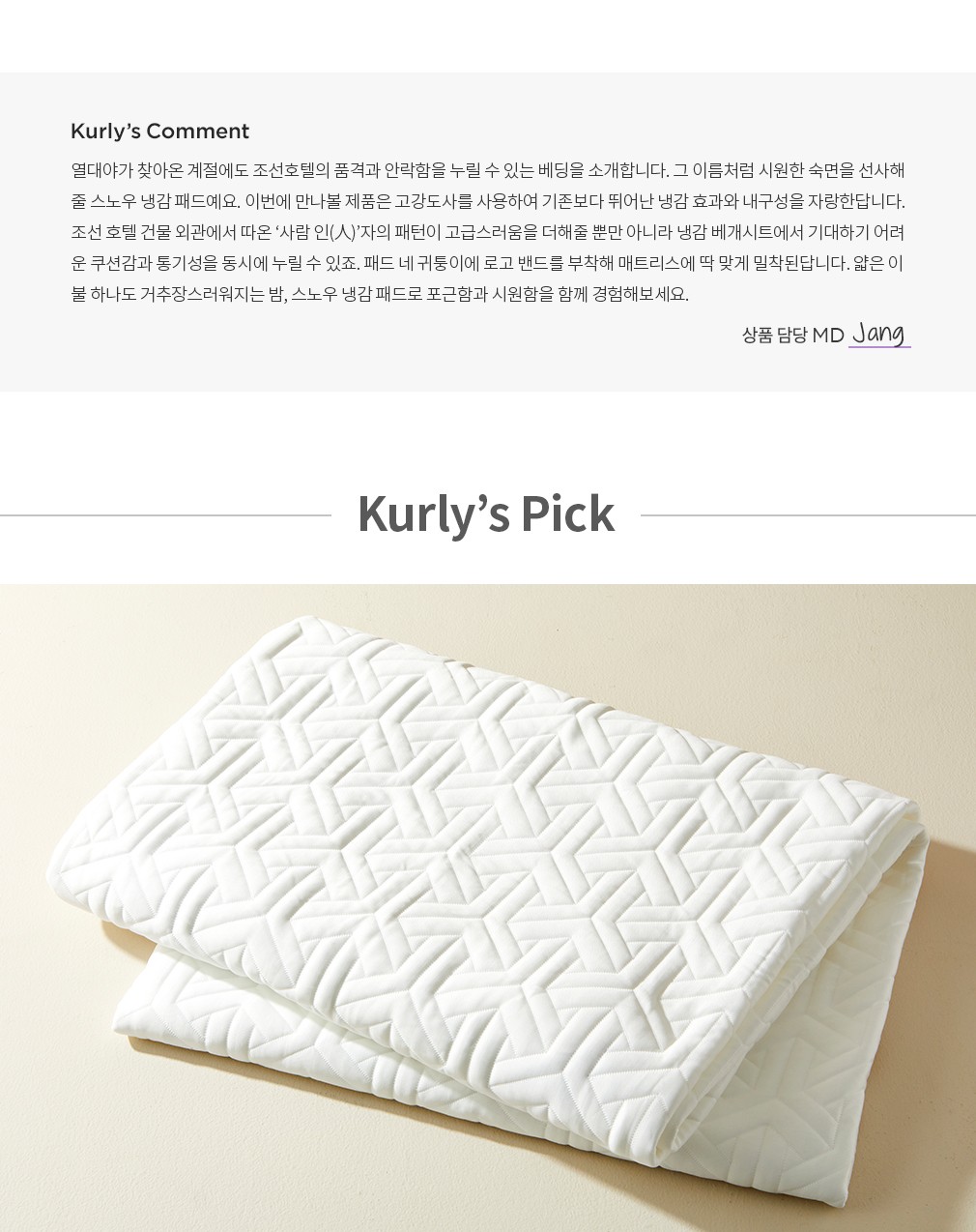포근함과 시원함을 동시에 누리는 방법 한여름밤의 더위도, 에어컨의 냉기도 두려운 열대야에는 숙면을 꿈꾸기 더욱 어려워지죠. 스노우 냉감 패드에는 오랜 시간 꿈결 같은 잠자리를 선사해온 조선호텔의 노하우가 담겨 있습니다. 열 전도율이 높은 폴리에틸렌 원사로 짜낸 삼중직 원단으로, 피부에 닿는 즉시 시원한 터치감을 느낄 수 있죠. 패드가 체온을 쓱 가져간 후에는 열을 다시 분산하기 때문에 냉감 효과가 오래도록 지속돼요. 인(人)자 패턴이 부드럽고 폭신한 굴곡을 형성하고 있어, 한여름엔 기대하기 어려운 포근함과 통기성을 동시에 누릴 수 있답니다.