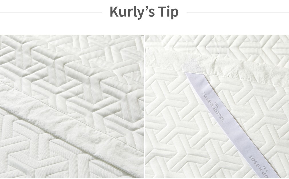 ・ 패드의 네 귀퉁이에는 조선호텔의 로고가 새겨진 밴드가 부착되어 있어요. 신축성이 뛰어나 매트리스에 딱 맞게 밀착됩니다.