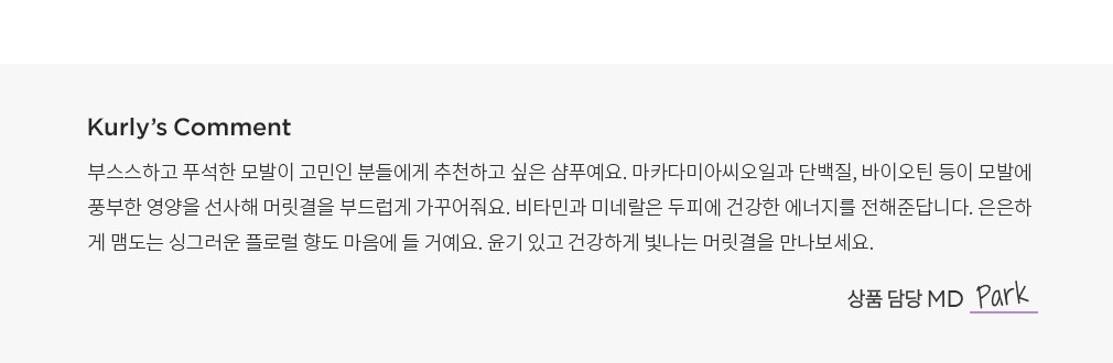 ・ 특징 : 모발을 부드럽고 윤기 있게 케어하는 샴푸입니다.
