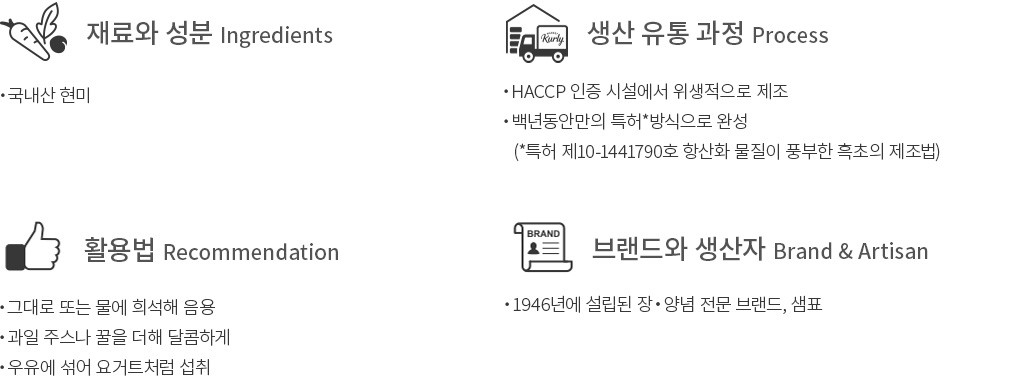 ‘식초의 왕’이라 불리는 흑초. 이번에는 백년동안의 특별한 노하우로 완성한 순발효흑초 원액을 소개할게요. 국내산 현미를 사용해 특허*받은 방식으로 완성한 흑초랍니다. 주정을 사용하지 않고 통알곡 현미를 3단계에 걸쳐 천천히 자연 발효해 더욱 특별하죠. 원물 고유의 영양과 풍미를 고스란히 담아냈기에 믿고 드실 수 있답니다. 하루 세 번 이상 꾸준히 섭취해 보세요. 물에 희석해 드시거나, 과일 주스에 더해 달콤하게 즐겨도 좋을 거예요.