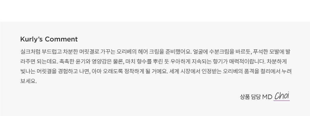 ・ 특징 : 모발을 부드럽고 윤기나게 가꿔주는 크림 형태의 에센스예요. 푸석한 모발을 차분하게 정돈합니다.