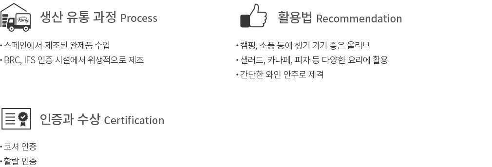 ・특징 : 산뜻한 풍미가 매력적인 그린올리브입니다.