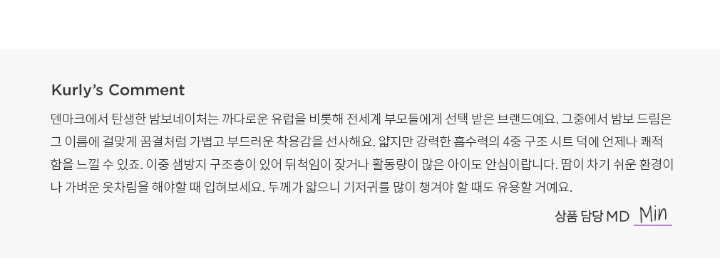 유의사항 ・간혹 아이의 활동량과 몸무게에 따라 고분자흡수체(SAP)가 방수층을 뚫고 새어 나올 수 있으나, 피부에 닿아도 해가 되지는 않아요. 몸에 묻은 흡수체는 미온수로 깨끗하게 씻어주세요.